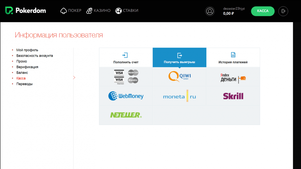 Для начала остановимся на том, как вывести деньги с ПокерДом, эта процедура реализована в комнате довольно просто. Она не должна вызвать затруднений даже у совсем еще «зеленых» новичков. Алгоритм действий здесь следующий: войти в учетную запись, перейти в раздел «Касса», нажать на ссылку «Получить выигрыш», выбрать из представленного списка нужную платежную площадку, вписать сумму и завершить операцию кликом по кнопке «Получить».